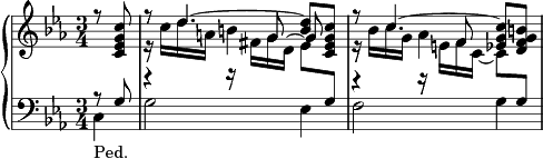 Das Pedal trägt wie gesagt das Thema solo vor. Die erste und zweite Variation leben von statischer, wehmütig verschleierter Vorhaltsharmonik. Unablässig kommt folgendes Akkordmotiv zum Einsatz: